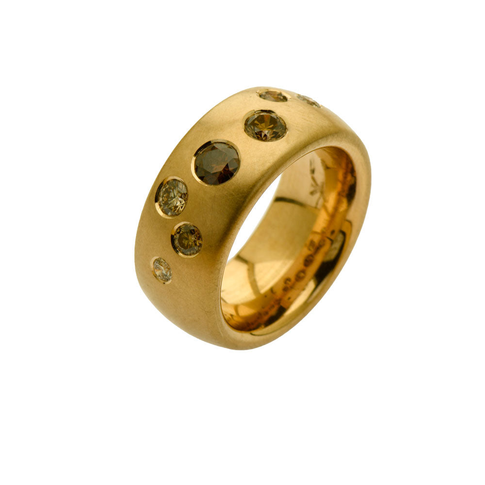 Bei dem Schmuckstück handelt es sich um einen in Handarbeit gefertigten Ring "Farbenspiel" aus 750 Rotgold mit sieben braunen Brillanten, zusammen 1,05 ct, Hearts and Arrows Steine, mit sehr sehr kleinen bis kleinen Einschlüssen. Der Ring hat eine Höhe von 3,5 mm, eine Breite von 10 mm und die Ringweite 55.