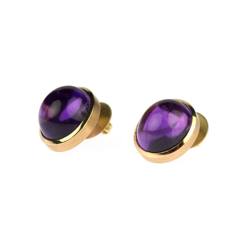 Bei dem Schmuckstück handelt es sich um ein Paar in Handarbeit gefertigte Ohrstecker "Lotte" aus 750 Roségold mit Platinstiften mit zwei ovalen Amethystcabochons zusammen ca. 19 ct. Die Ohrstecker haben eine Höhe von ca. 15,5 mm und eine Breite von ca. 13,5 mm.