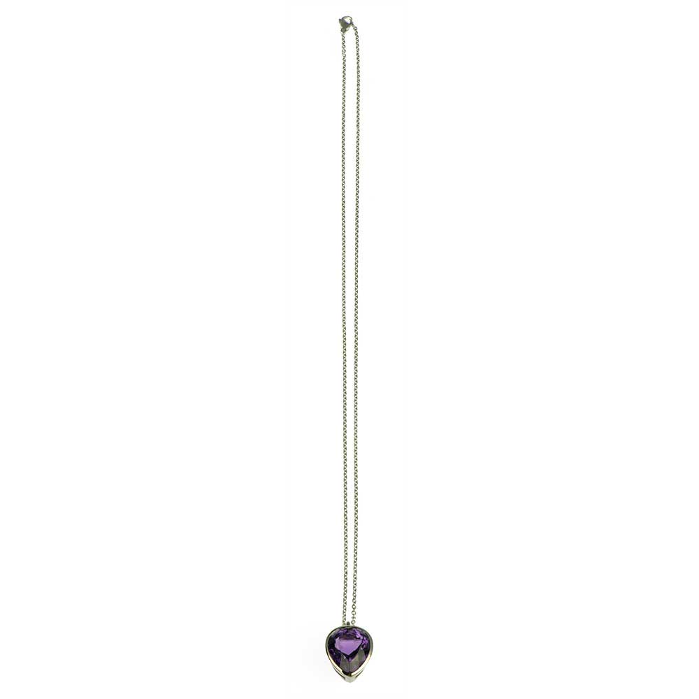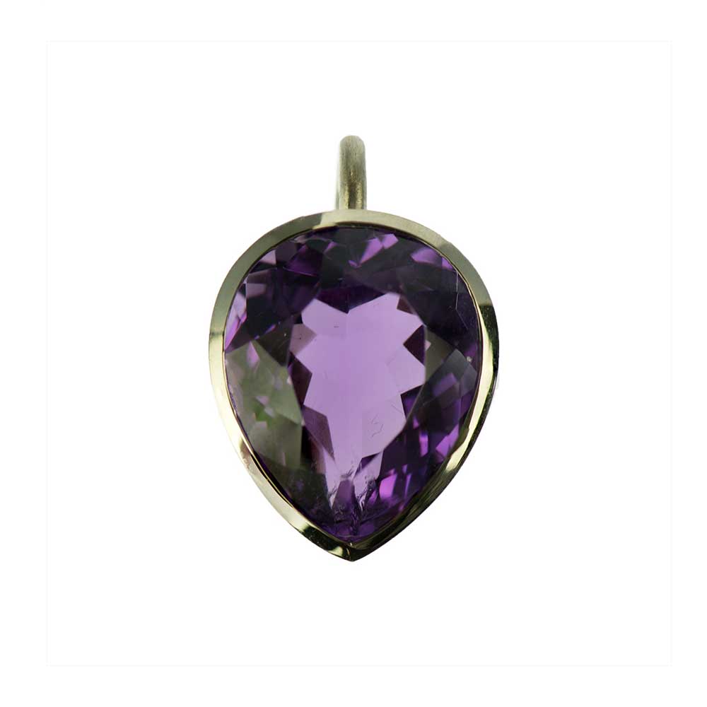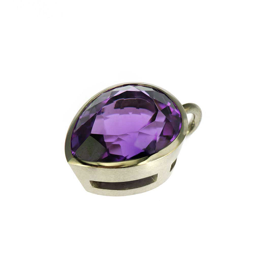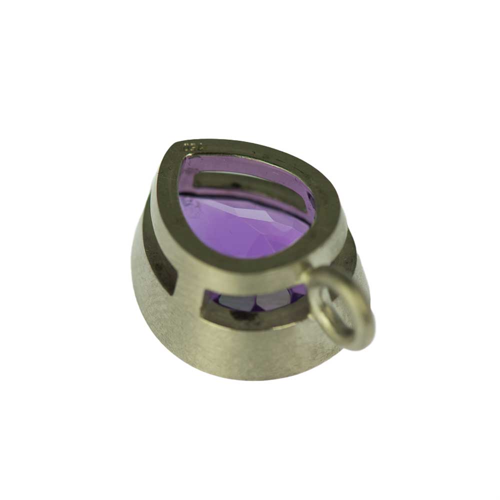 Bei dem Schmuckstück handelt es sich um einen in Handarbeit gefertigten Anhänger "Violet" aus 750 Weißgold mit einem tropfenförmigen facettierten Amethyst von ca. 11,12 ct. Der Anhänger hat eine Breite von 15 mm und eine Höhe von 18 mm.
