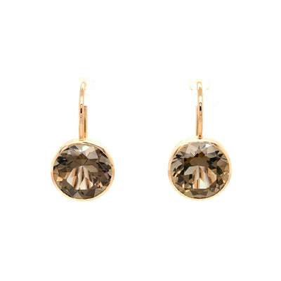 Bei dem Schmuckstück handelt es sich um ein Paar in Handarbeit gefertigte Ohrhänger "Herbstzauber" aus 750 Rotgold mit zwei runden facettierten Rauchquarzen, zusammen ca. 11,48 ct, aus eigener Werkstatt. Die Ohrhänger haben einen Durchmesser von 13 mm.