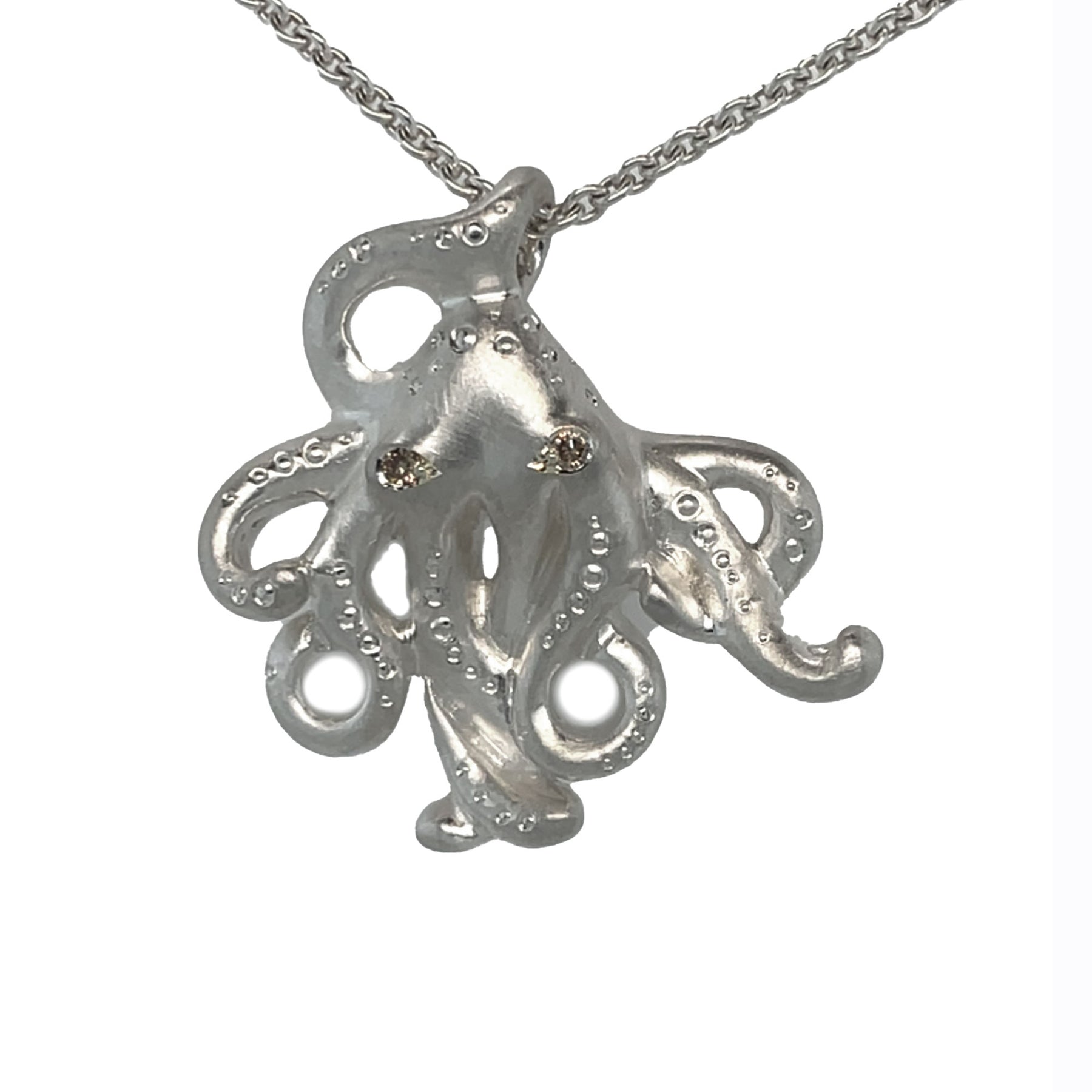 Bei dem Schmuckstück handelt es sich um einen in Handarbeit gefertigten Anhänger "Krake Pablo" aus 925 Silber mit zwei champagnerfarbenen Brillanten, zusammen ca. 0,02 ct mit kleinen Einschlüssen (C2/si), aus eigener Werkstatt. Der Anhänger hat eine Höhe von 30 mm und eine Breite von 31 mm.
