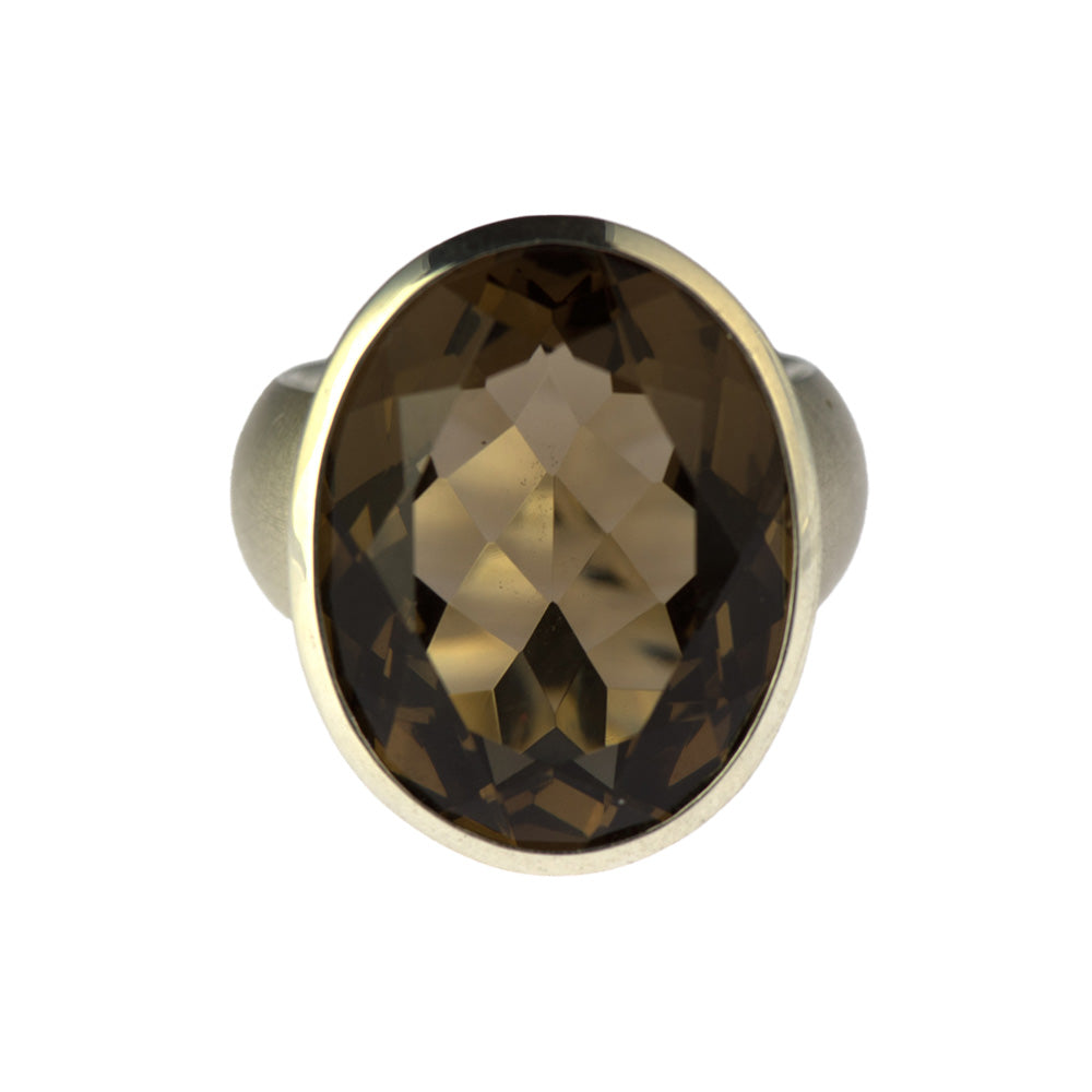 Bei dem Schmuckstück handelt es sich um einen in Handarbeit gefertigten Ring "Alice" aus 925 Silber mit einem ovalen facettierten Rauchquarz, ca. 20,5 ct. Der Ring hat eine Höhe von 2,7 mm, eine Breite von 8,8 mm und die Ringweite 57.