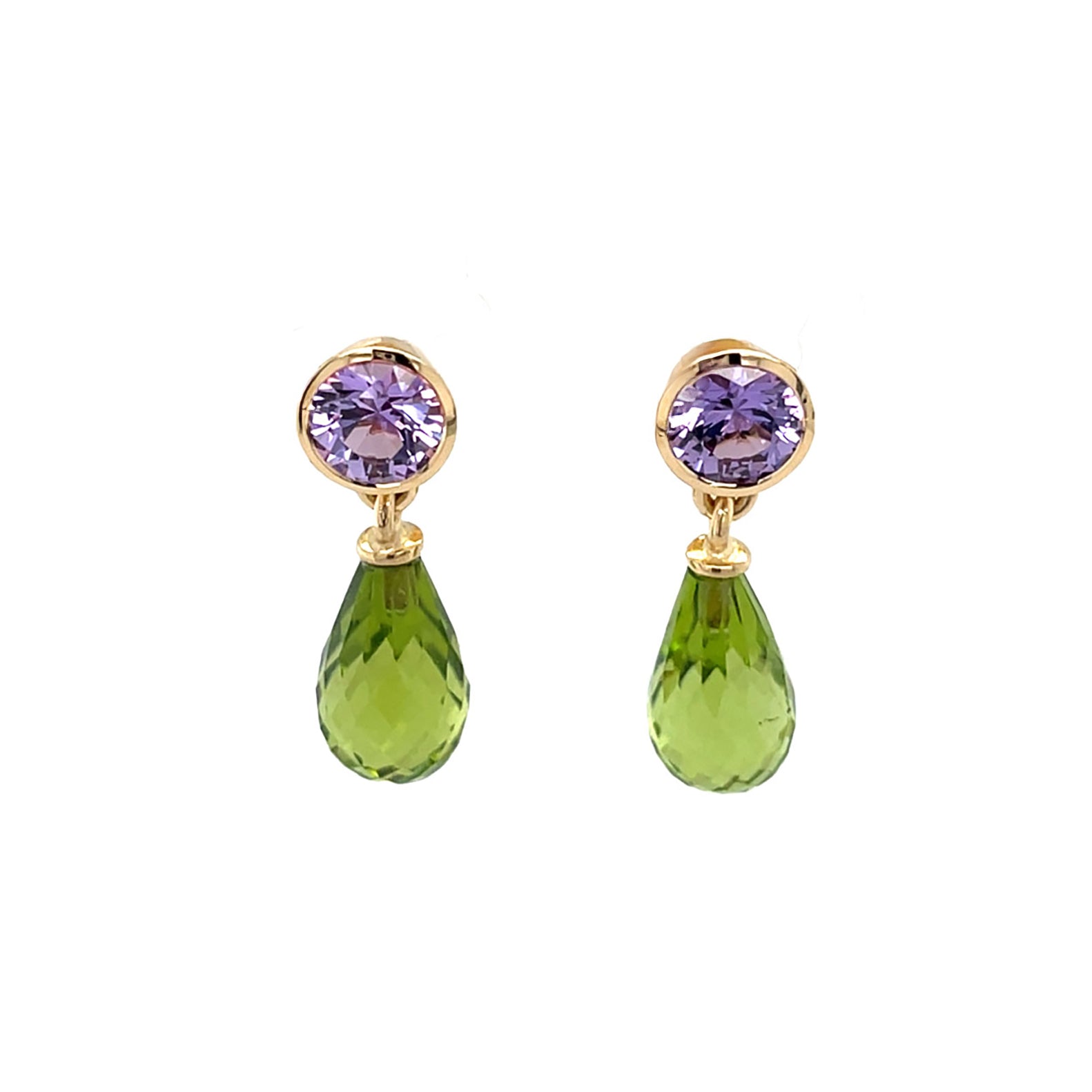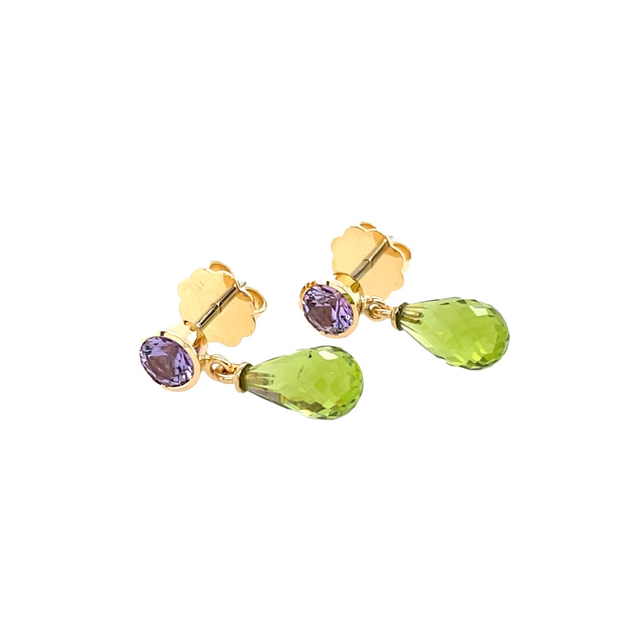 Bei dem Schmuckstück handelt es sich um ein Paar in Handarbeit gefertigte Ohrhänger "Midsommar" aus 750 Gelbgold mit zwei runden facettierten lila Saphiren, zusammen ca. 1,17 ct und zwei facettierten Peridotpampeln, zusammen ca. 5,88 ct. Die Ohrhänger haben eine Breite von 6 mm.