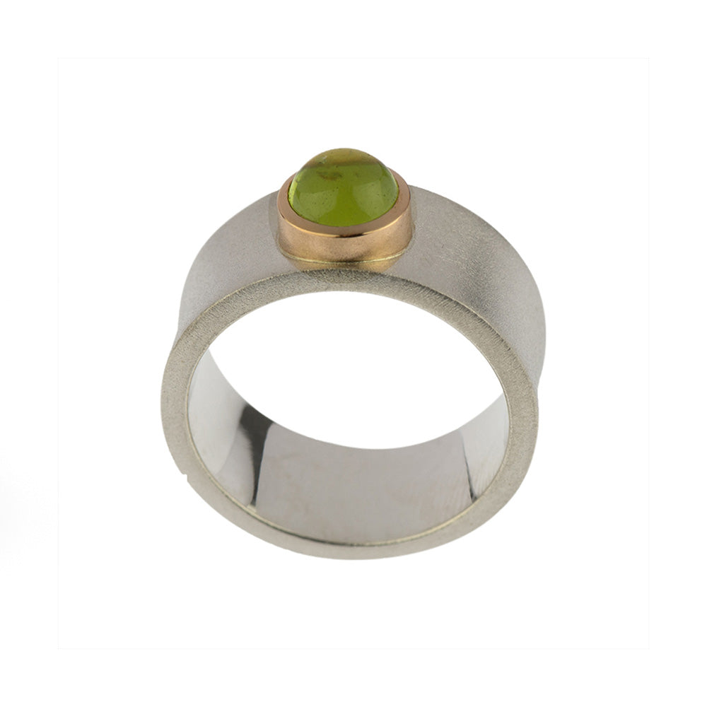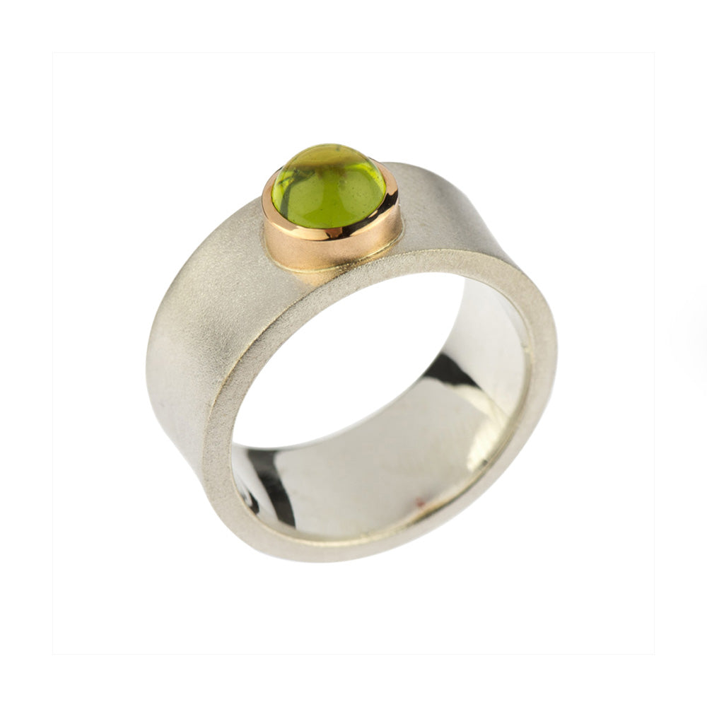 Bei dem Schmuckstück handelt es sich um einen in Handarbeit gefertigten Ring "Only" aus 925 Silber und 750 Rotgold mit einem Peridotcabochon von ca. 1,78 ct. Der Ring hat eine Höhe von 2 mm, eine Breite von 10 mm und die Ringweite 61.