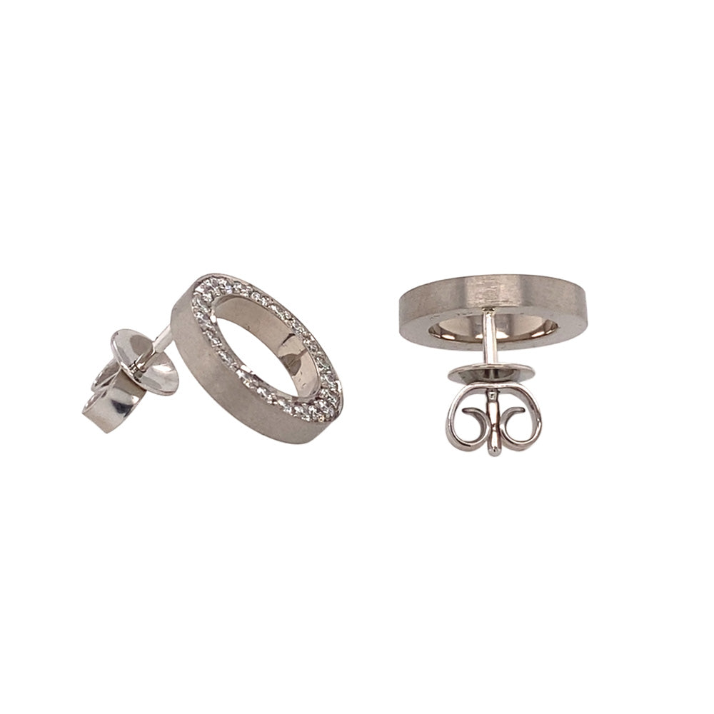 Bei dem Schmuckstück handelt es sich um ein Paar in Handarbeit gefertigte Ohrstecker "Karma" aus 750 Weißgold und Platinstiften mit 42 Brillanten von zusammen ca. 0,54 ct, feines Weiß mit sehr kleinen Einschlüssen (Tw/vs). Die Ohrstecker haben eine Höhe von 2,5 mm, eine Breite von 2,2 mm und einen Durchmesser von 13,6 mm.