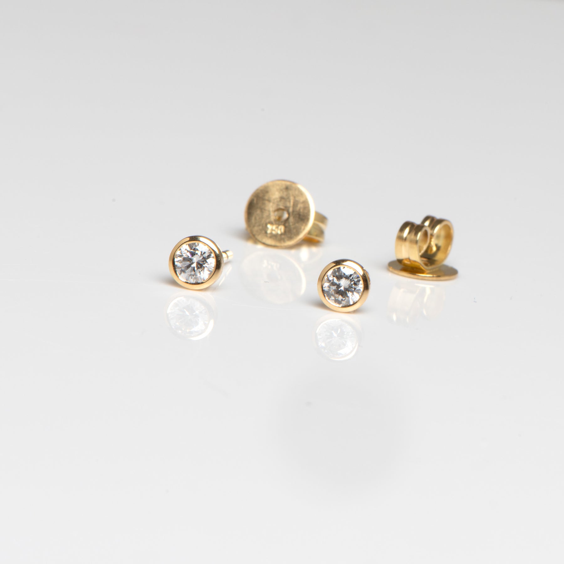 Bei dem Schmuckstück handelt es sich um ein Paar in Handarbeit gefertigte Ohrstecker "Spot" aus 750 Gelbgold mit Platinstiften mit zwei Brillanten von zusammen ca. 0,26 ct, feines Weiß mit sehr sehr kleinen Einschlüssen (Tw/vvs). Die Ohrstecker haben einen Durchmesser von 4,3 mm.