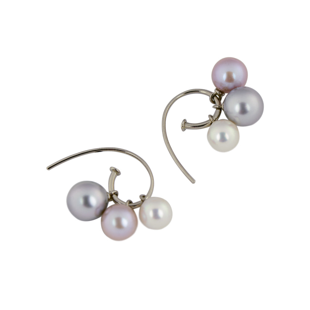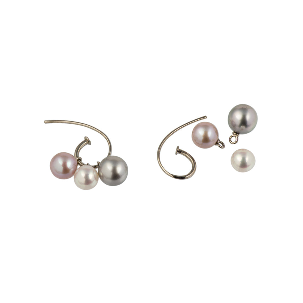 Bei dem Schmuckstück handelt es sich um ein Paar in Handarbeit gefertigte Ohrhänger "Farbwechsel" aus 750 Weißgold mit drei auswechselbaren Zuchtperlenpaaren in weiß natur, rosa natur und Tahiti-grau.