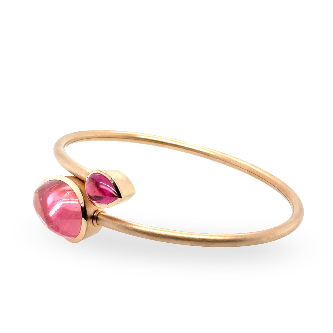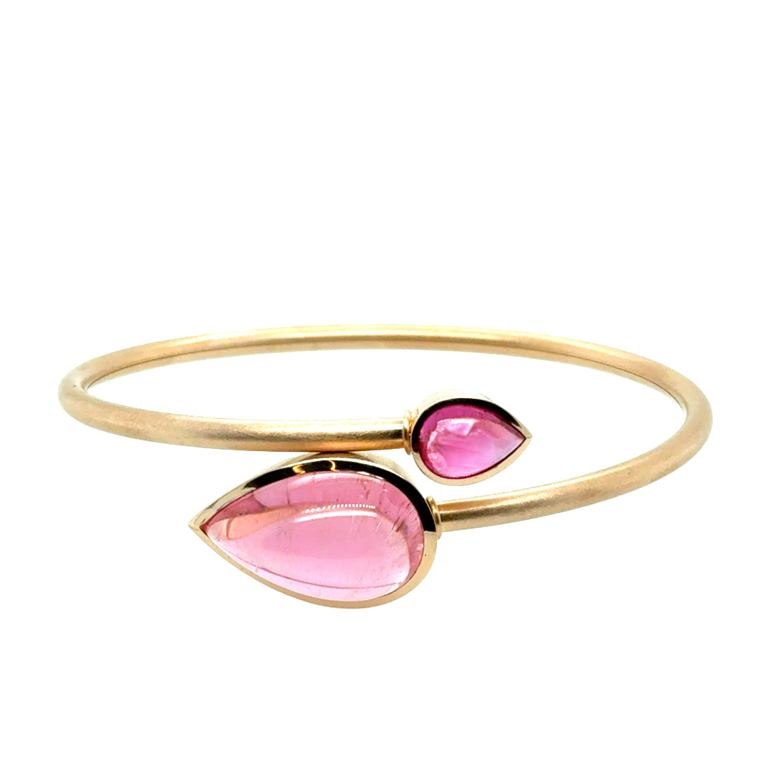 Bei dem Schmuckstück handelt es sich um einen in Handarbeit gefertigten Armschmuck "Rosalie" aus 750 Rotgold mit zwei rosa Turmalincabochons in Tropfenform, zusammen ca. 18,46 ct. Der Armreif hat eine Breite von 66 mm, eine Höhe von 56 mm und eine Stärke von 3 mm.
