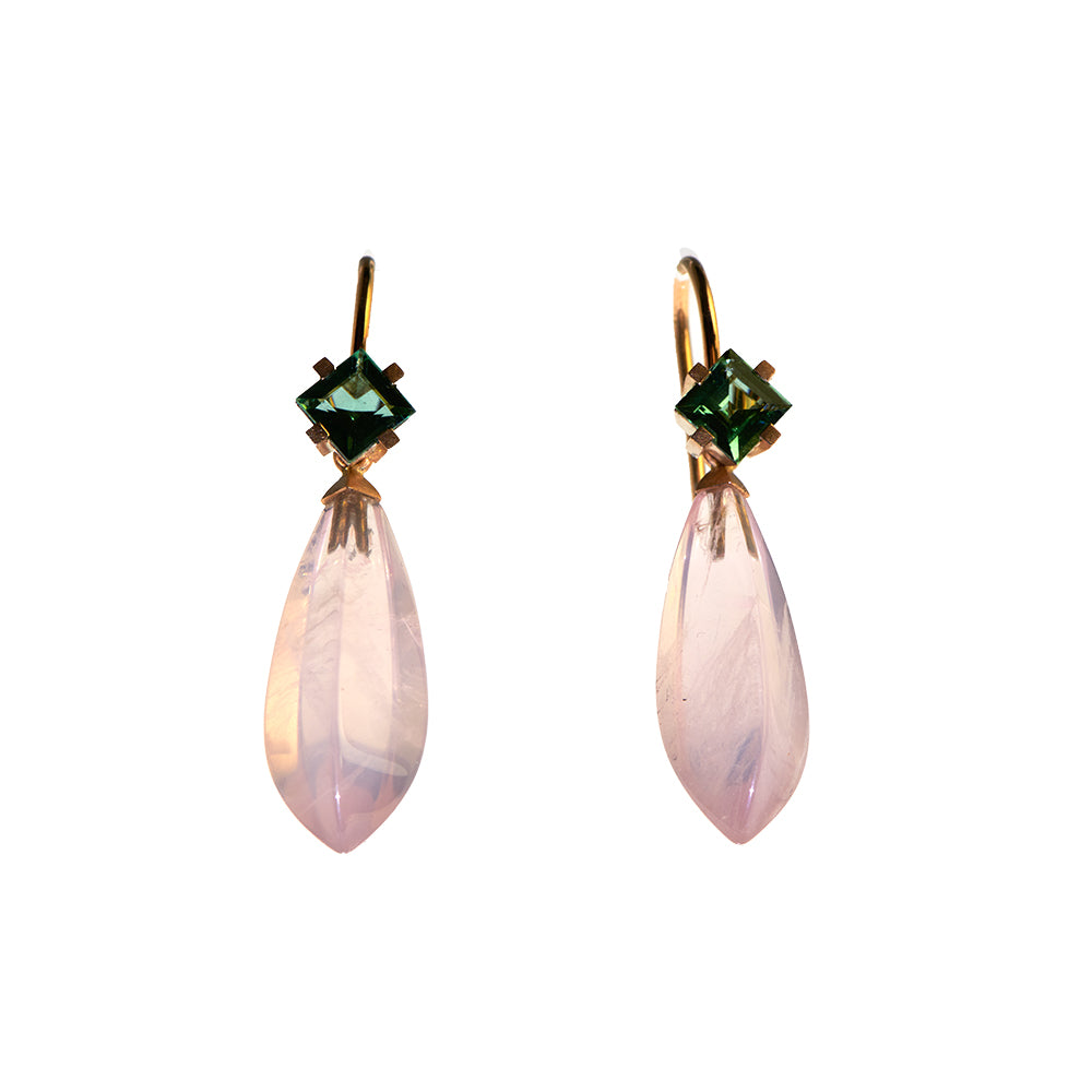 Bei dem Schmuckstück handelt es sich um einen in Handarbeit gefertigten Ohrschmuck "Summertime" aus 750 Rotgold mit zwei grünen Turmalincarrées, zusammen ca. 1,18 ct und zwei abnehmbaren Rosenquarzpampeln. Der Ohrschmuck hat eine Breite von 7,1 mm.