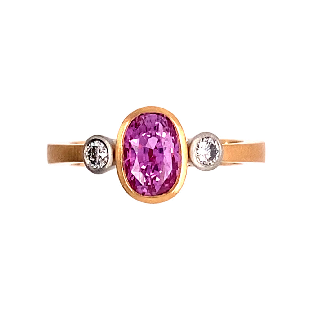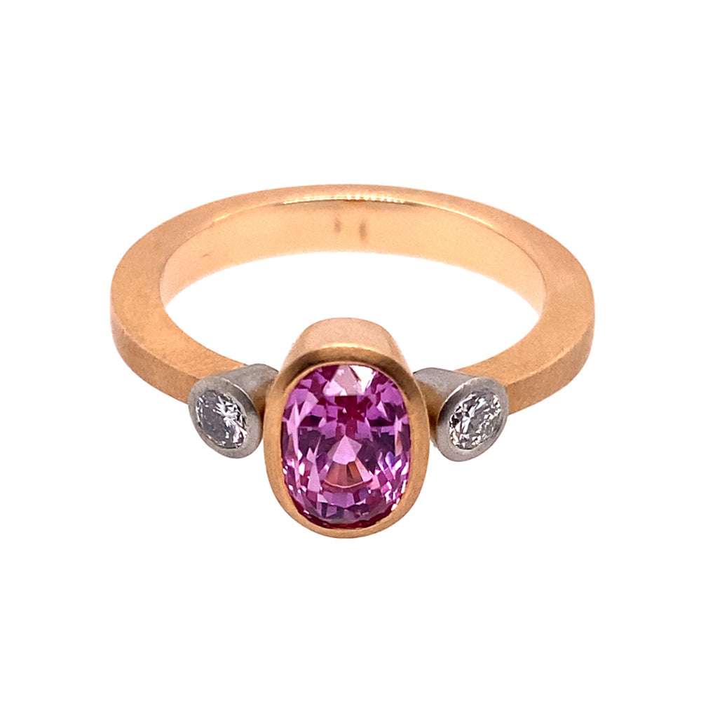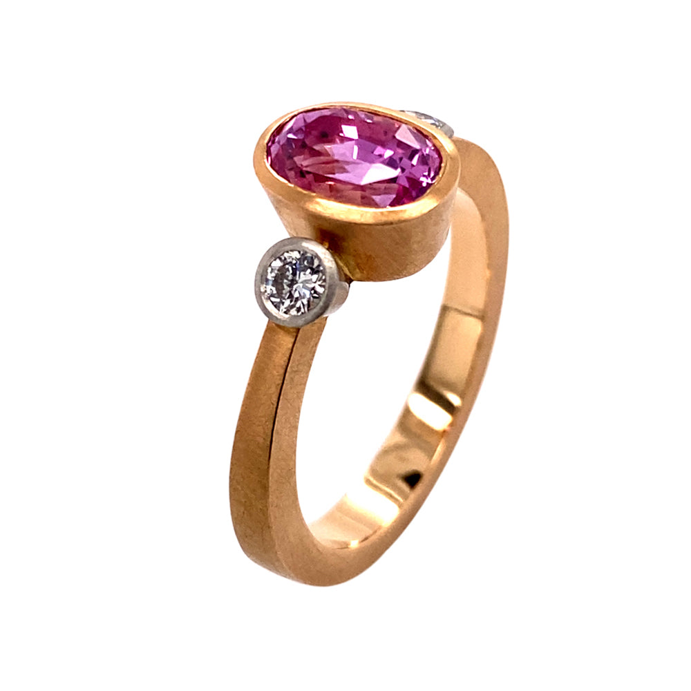Bei dem Schmuckstück handelt es sich um einen in Handarbeit gefertigten Ring "Tres" aus 750 Rotgold und 950 Platin mit einem ovalen facettierten pinken Saphir von ca. 2,2 ct und zwei Brillanten von zusammen ca. 0,20 ct, feines Weiß mit sehr sehr kleinen Einschlüssen (Tw/vs). Der Ring hat eine Breite von 3 mm und die Ringweite 54,5.