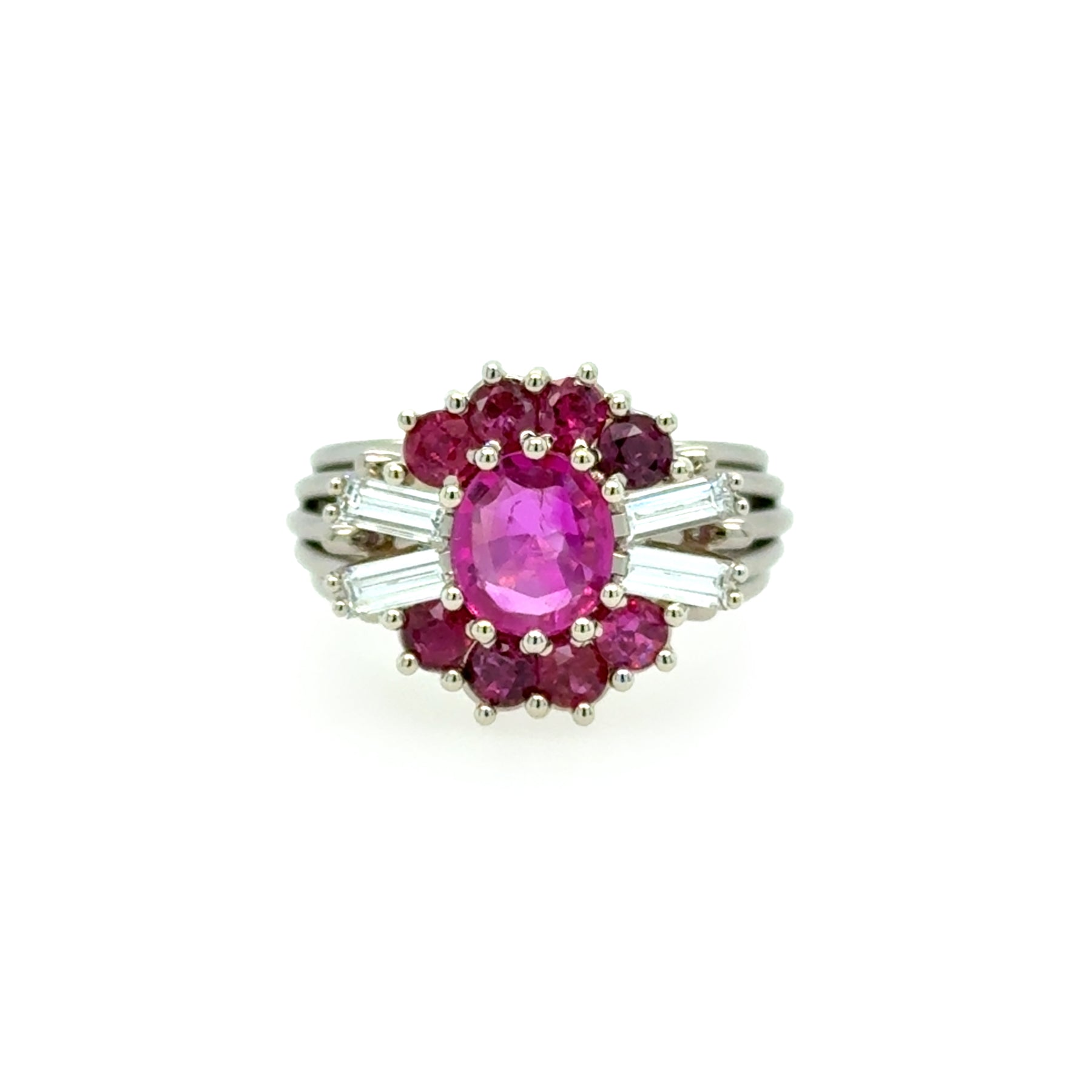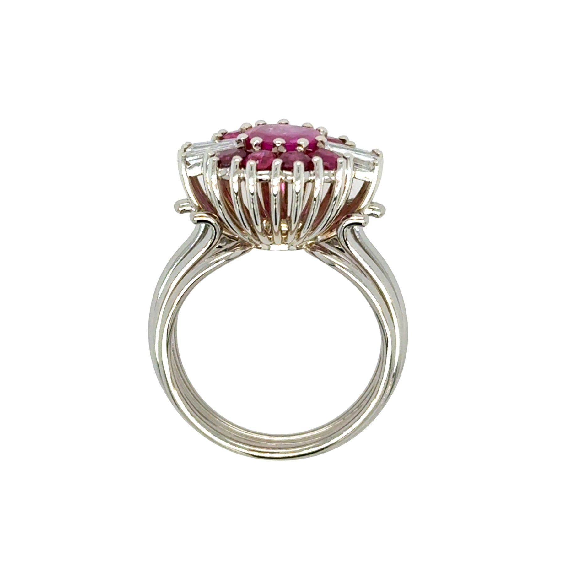 Bei dem Schmuckstück handelt es sich um einen in Handarbeit gefertigten Ring "Seventies one" aus 750 Weißgold mit neun facettierten Rubinen, zusammen ca. 1,86 ct und vier Diamantbaguettes zusammen ca. 0,47 ct, feines Weiß mit sehr kleinen Einschlüssen (Tw/vs). Der Ring hat die Weite 52.
