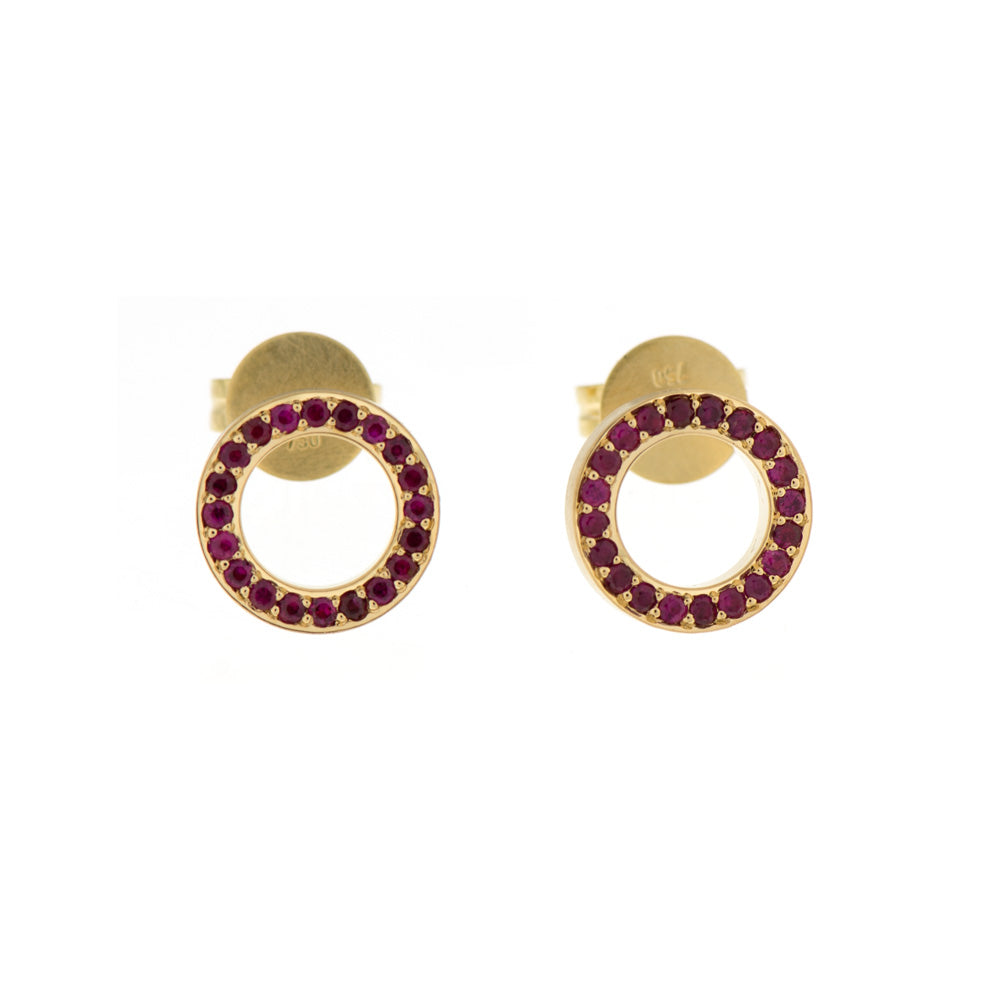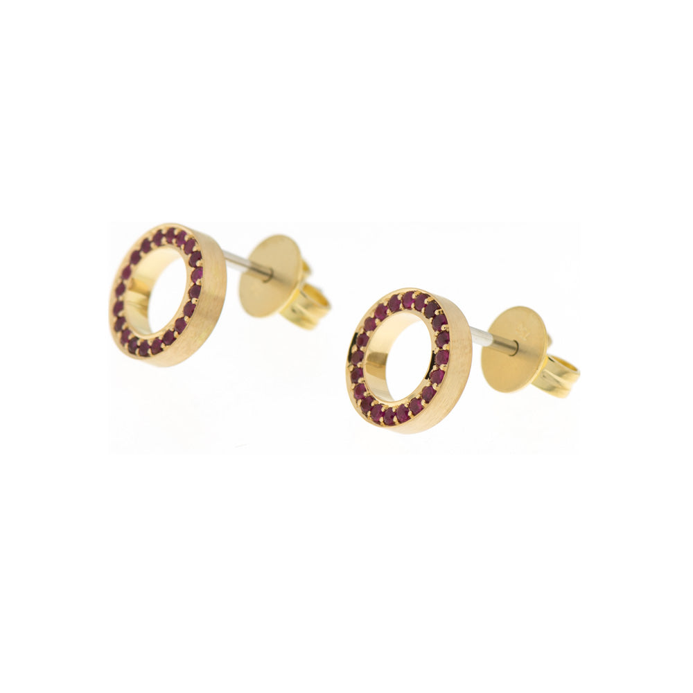 Bei dem Schmuckstück handelt es sich um ein Paar in Handarbeit gefertigte Ohrstecker "Karma littles" aus 750 Gelbgold und Platinstiften mit 40 Rubinen von zusammen ca. 0,35 ct. Die Ohrstecker haben eine Höhe von 2,2 mm, eine Breite von 1,8 mm und einen Durchmesser von 9,6 mm.