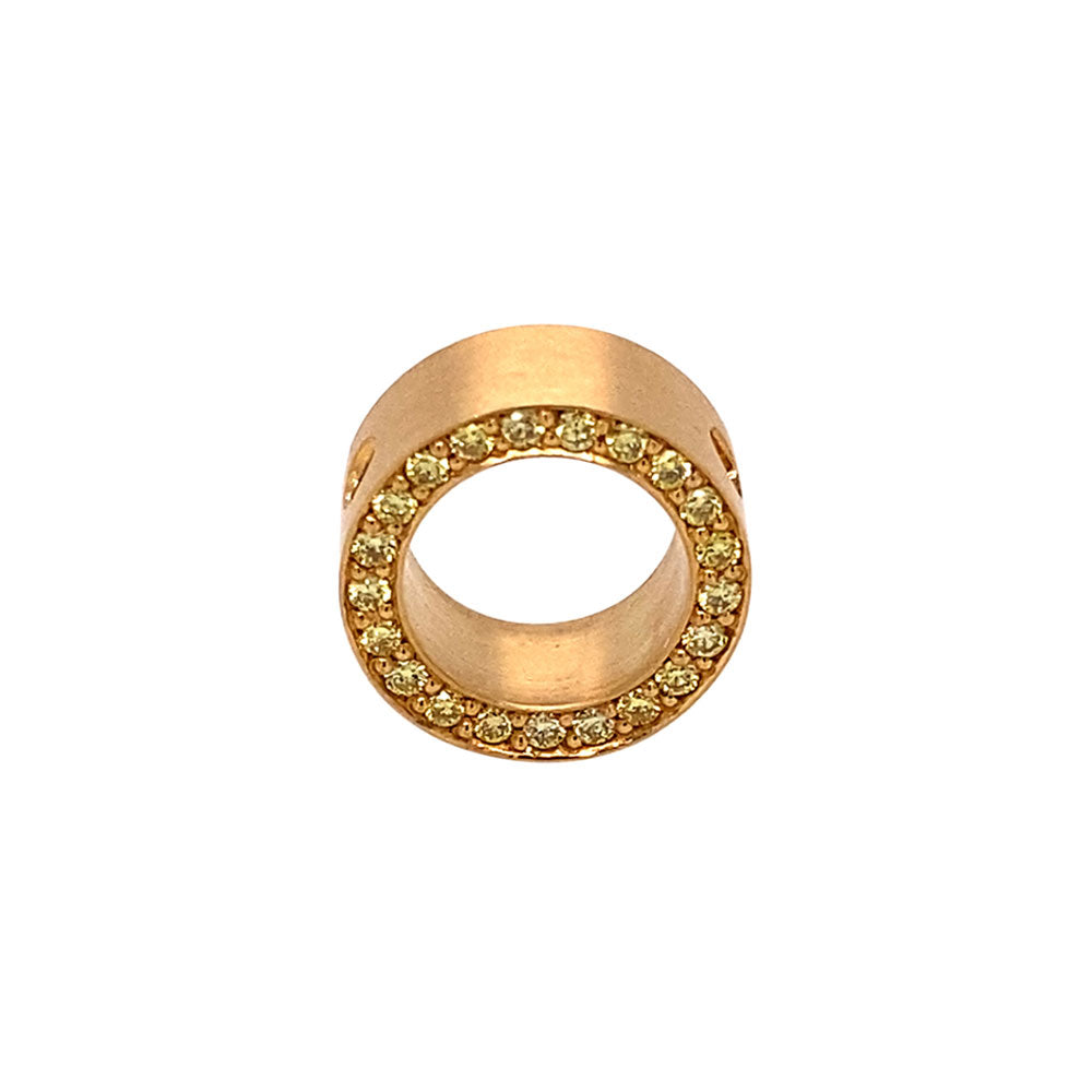 Bei dem Schmuckstück handelt es sich um einen in Handarbeit gefertigten Anhänger "Karma" aus 750 Gelbgold mit 21 gelben Brillanten von zusammen ca. 0,25 ct, fancy Yellow mit kleinen bis sehr sehr kleinen Einschlüssen (FY/si-vvs). Der Anhänger hat eine Höhe von 6 mm, eine Breite von 2,1 mm und einen Durchmesser von 13,4 mm.