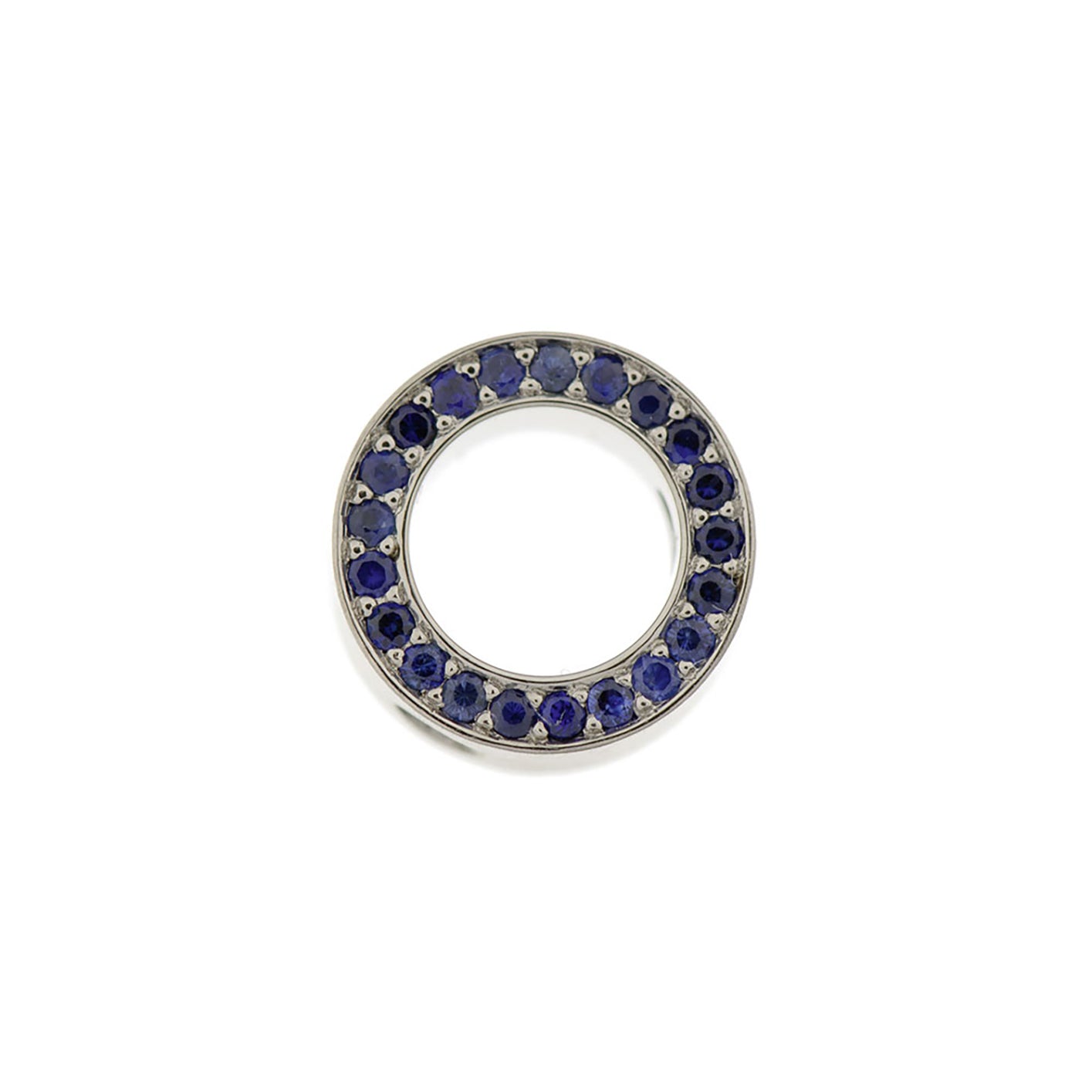 Bei dem Schmuckstück handelt es sich um einen in Handarbeit gefertigten Anhänger "Karma littles" aus 750 Weißgold mit 21 blauen Saphiren von zusammen ca. 0,16 ct. Der Anhänger hat eine Höhe von 5 mm, eine Breite von 1,8 mm und einen Durchmesser von 9,6 mm.