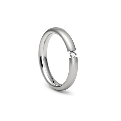 Bei dem Schmuckstück handelt es sich um einen Spannring S "Oval" der Manufaktur Niessing aus 950 Platin mit einem Brillanten von ca. 0,06 ct feines Weiß mit sehr kleinen Einschlüssen (TW/vs). Der Ring hat eine Höhe von 2,1 mm, eine Breite von 2,9 mm und eine Ringweite von 50.
