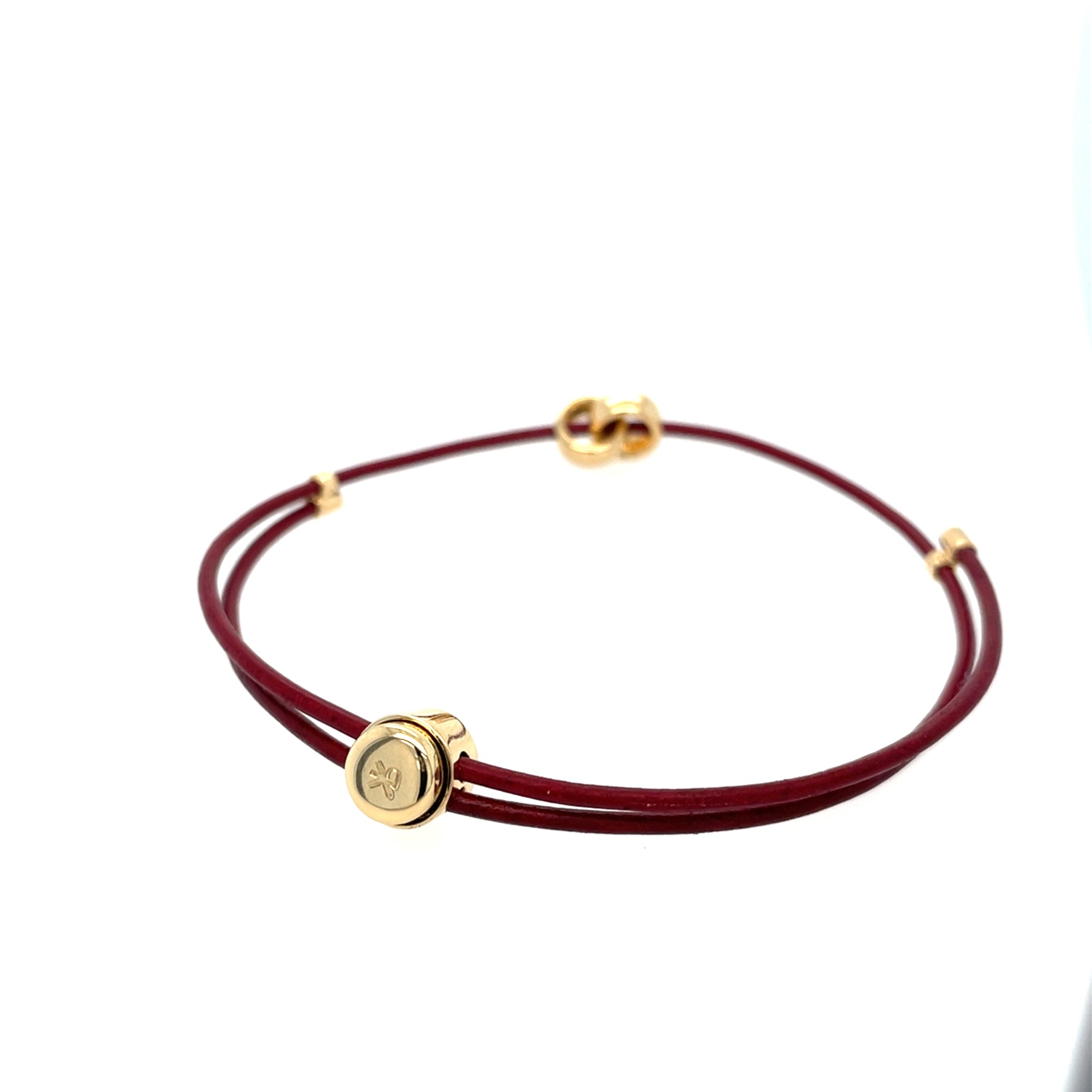 Bei dem Schmuckstück handelt es sich um ein in handarbeit gefertigter Armschmuck "Red Infinity" aus 750 Gelbgold und einem roten Antilopenlederband. Das Lederband hat eine Dicke von 1,5 mm.