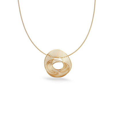 Bei dem Schmuckstück handelt es sich um einen Anhänger "Mirage Loop" der Manufaktur Niessing aus 750 Gelbgold. Der Anhänger hat einen Durchmesser von 27,5 mm.